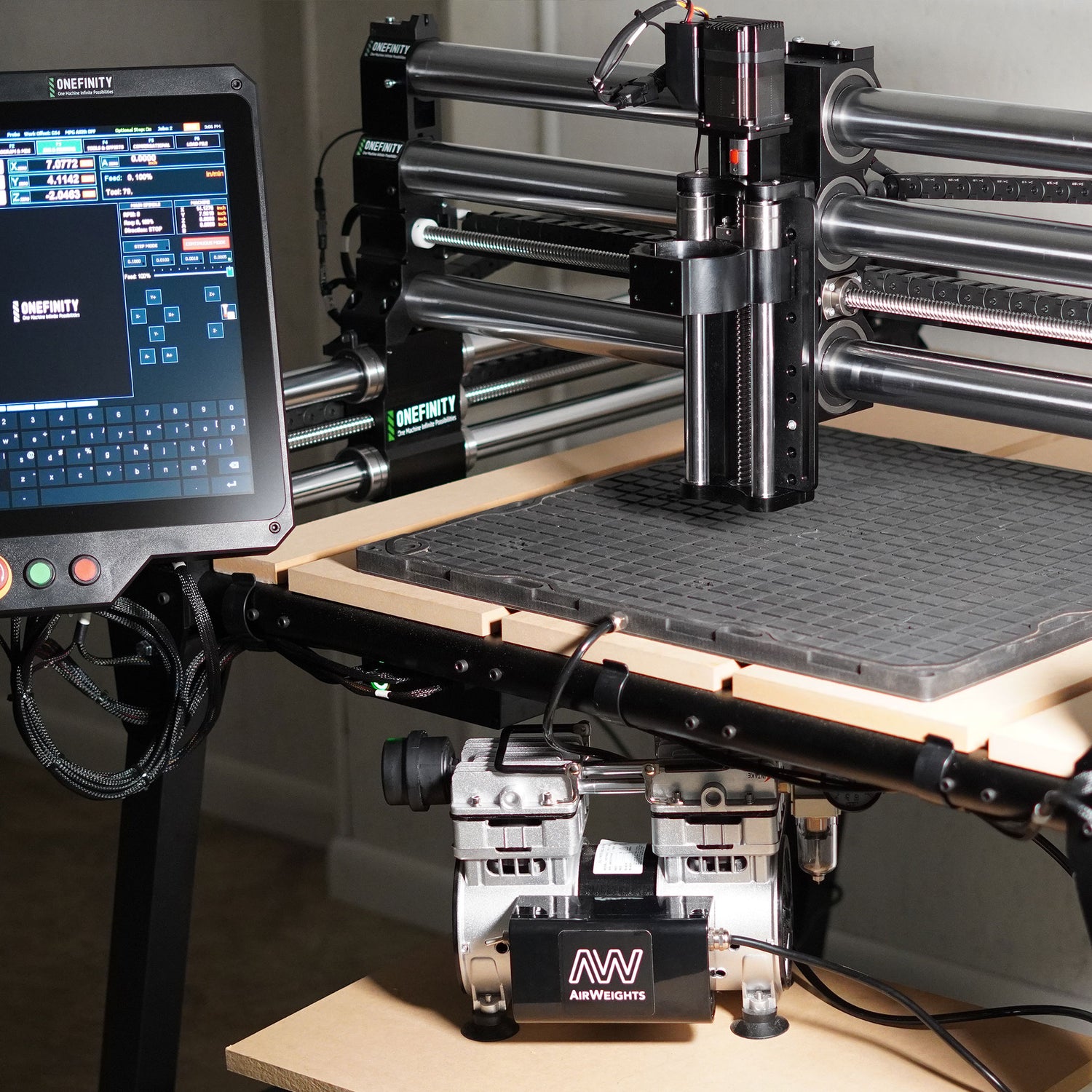The AirWeights system is designed to mount to any CNC machine, and setup is quick and easy. You can remove the AirWeights at any time, and reinstall repeatably using the included locating pins.